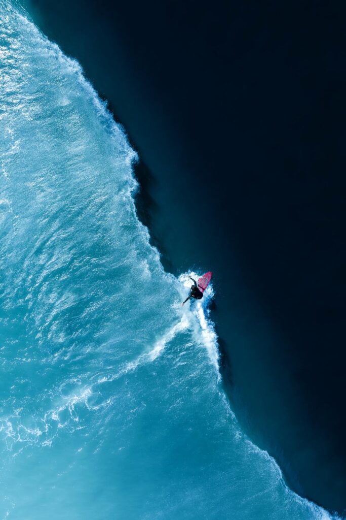 Top-down capture of a surfer riding a long, low wave that seemed to last forever. The wave held its break to form a diagonal, dividing calm water with an impending crash of the ocean’s force. Taken in Southampton, NY, USA.