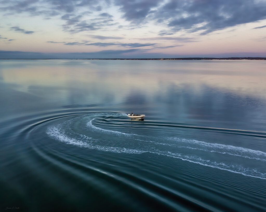 Aerial drone photography of a clammer (happens to be my father) heading out into Shinnecock Bay to dig for the day in his boat with a dead-calm morning refection. New York, 2021.