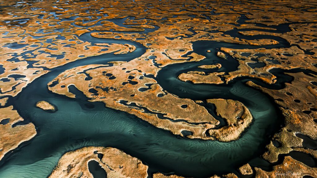 Abstract drone photography with a view of a marsh in Cape Cod, MA. Taken in autumn when the grasses begin to turn gold. The tide was low, displaying the green colors of the waterways.