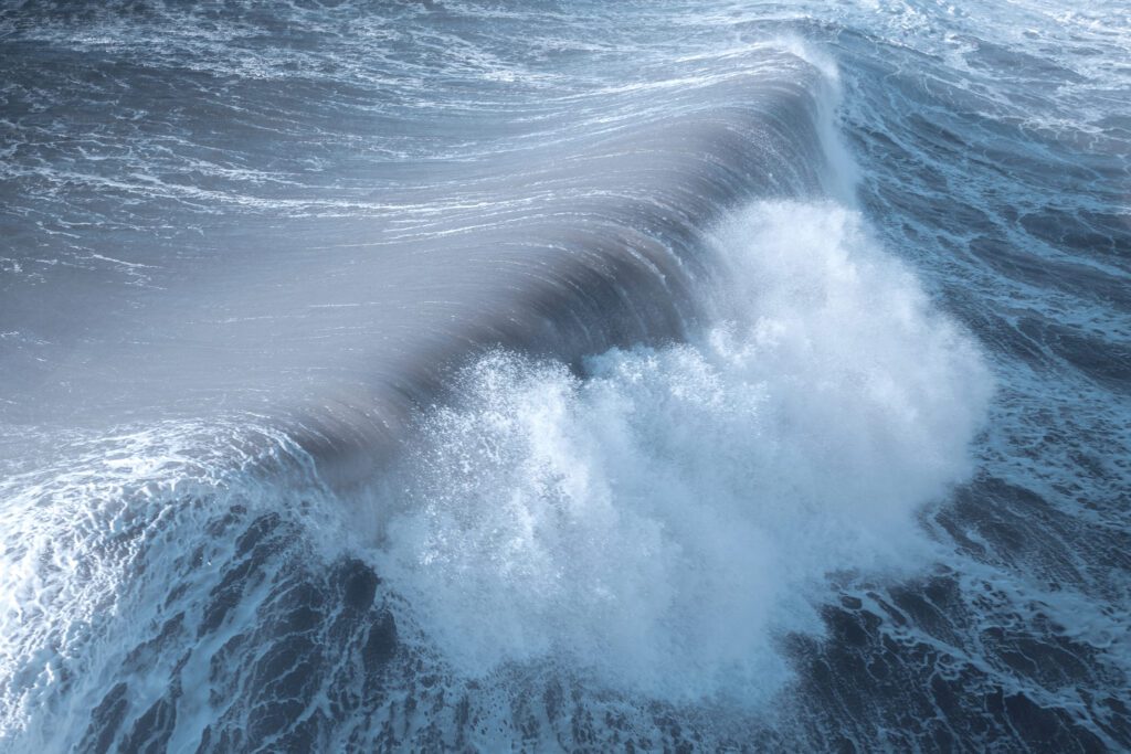 Aerial drone photograph of an Atlantic Ocean wave crashing on shore in the Hamptons, New York, USA. 2024.