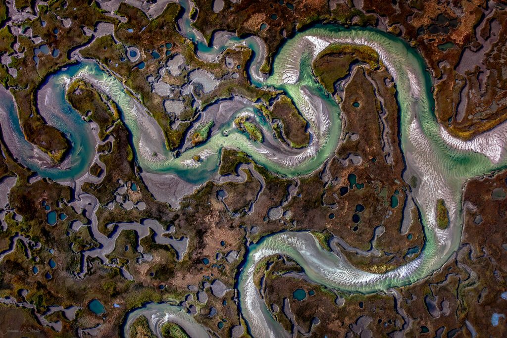 Top-down abstract aerial drone photograph of a marsh waterway. Cape Cod, MA. Merged image.