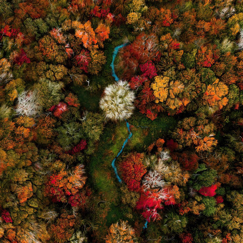 Top-down aerial drone photography of a small creek during the autumn months, displaying the fall foliage in all her splendor. Taken in Southampton, NY, USA. Siena Award Winner 2023.